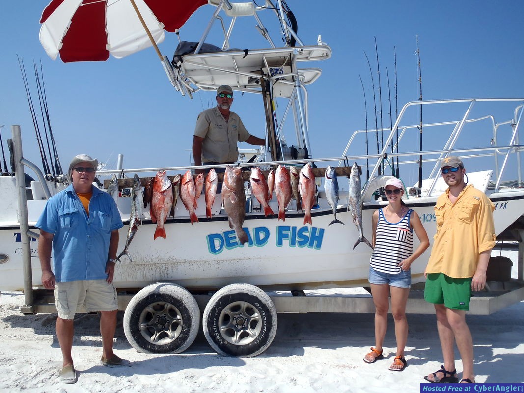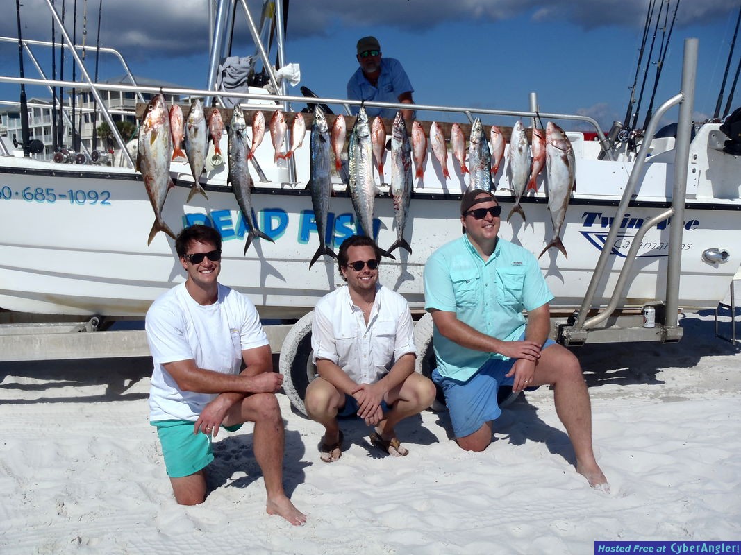 Whooo...; it's been busy here at the beach this Fall. Lots of folks around and plenty of pretty weather to take 'em fishing. Today is the first day since last month where it wouldn't be fun out there so I get to do chores and write a report (wish I could take a nap..) The fishing has been steady even after the big rain (flood ?) a few weeks ago, about the only thing all the rain did was run the Mahi off for a while. The water offshore has cleaned up quite a bit and we did have a school show up at the boat a couple days ago and were able to land a couple. The Vermillion Snapper bite remains strong with limit catches most trips. There are still plenty of AJ's in state waters but the number of big Bull sharks around makes it tough to land a legal one. The smaller jacks come to the boat relatively quick enough to land and throw back but when you get a "real one" on the sharks'll get 'em if you don't wind fast and hard. Still plenty of Scamps (what a treat !), but the Kings haven't shown up enough to be easy yet, we are catching 'em pretty regularly but just in select places, the water temp is still 80 degrees and they won't go into the fall frenzy till it drops just a little more. We had some nice Red Snapper this past weekend but had to work for 'em, hopefully they will be "easy" next weekend. A few grouper around, primarily reds but as always, they are the hardest fish to get to the boat !