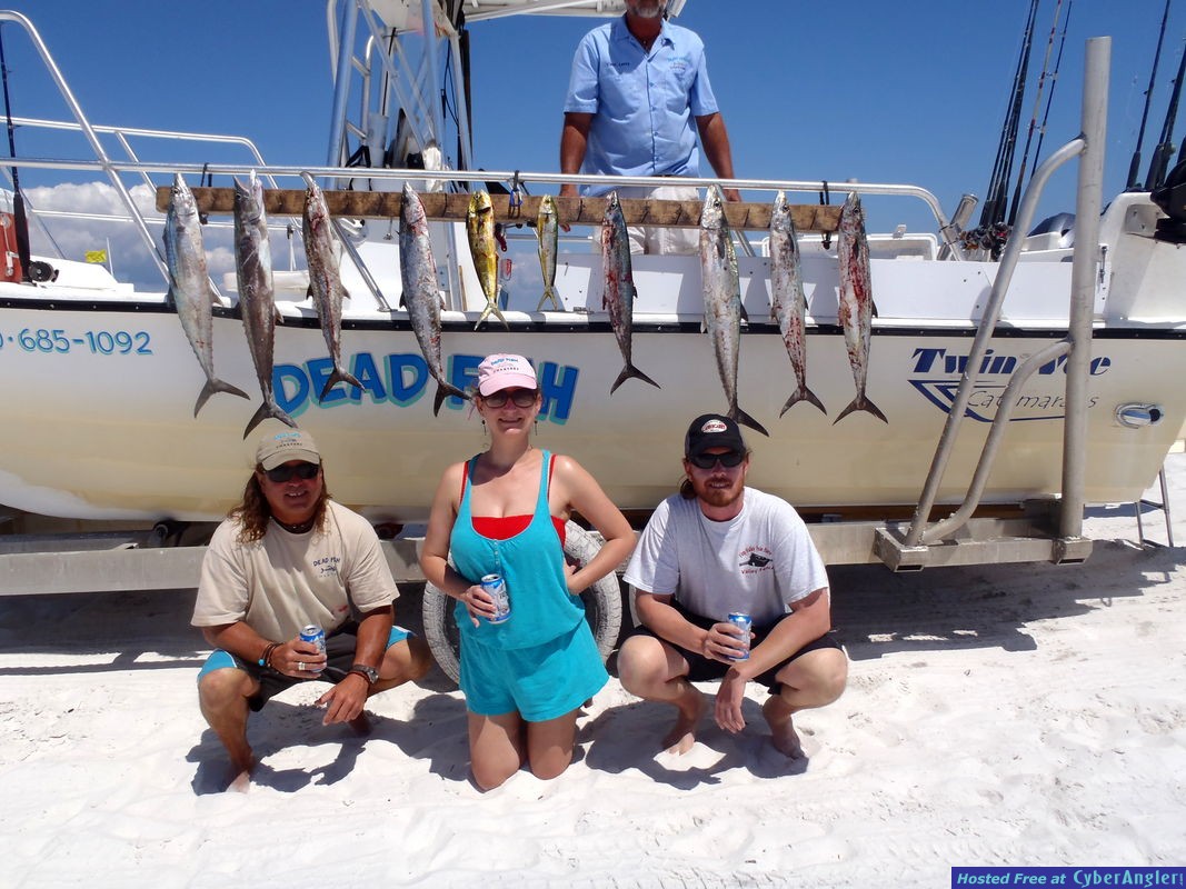 This afternoon I took my oldest daughter, her fiance' and my ace boat hand on a 2 hr play trip. It was blowy and bouncy.. they went 8 for 22 on the Kings and 2 for 3 on the Mahi.... LOTS of action but it's hard to wind and hold on at the same time...