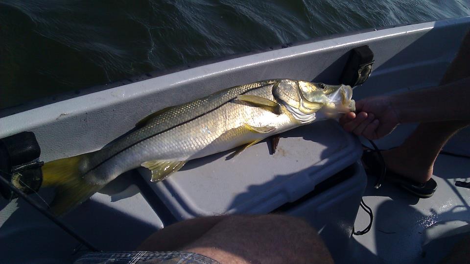 I was stroking the trout and caught this 28 inch snook on a white/red mirrolure suspending twitch bait out at ft. desoto park. First time ive ever used this lure and it worked great over the flats. I used to get caught in the weeds all the time, but this lure works great on the flats because it stays suspended at 10-12 inches and avoids getting snagged. A captain on this Fishing Social Network recommended it to me..