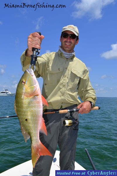 This Sunday found Dave, a trout guide from Wyoming www.JacksonHoleAnglers.com and his long time friend, Ken, from Pennsylvannia on the bow of my skiff for a half day break from exploring Miami. The plan was to mix it up in Biscayne Bay. We started with some shots at tarpon on the Oceanside including a string of 100lbers in 3' of water, always an impressive sight! We then switched to bonefish and some shots later our half day was running out. We had two choices, run far north to what promised to be fast bonefish action or take a short hop to mutton land. They decided upon mutton land, and as usual the muttons didn't disappoint. Minutes after arriving, Dave's rod bends over and the drag starts to scream. Unfortunately the hook pulled free and the beast swam free. Just minutes later and much smack talk amongst the two friends later, Ken's rod doubles over and the drag screams. A few seconds later Dave's rod bends over also and now the sweet sound of two drags screaming in tandem filled the air. The action continued until quitting time and smiles and more trash talk were plentiful as we crossed Biscayne Bay on the way back to the ramp. Days like these are common right now so get out there and make that drag scream!