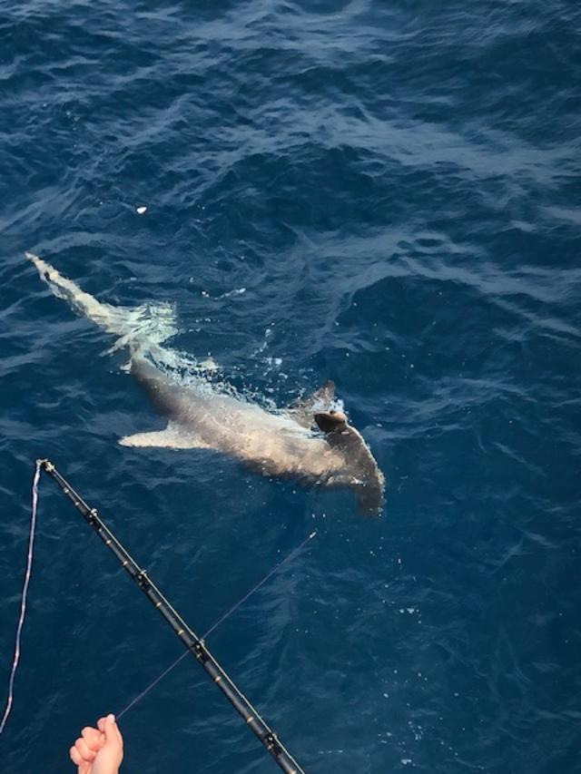 We then decided to try for Snappers and a Shark. The first mate rigged a bait, tossed it in the water and sent the bait down to the bottom. Before he could set the bait away from the boat the rod bent over, and we had a big fish on. Harrison and his wife took turns fighting the fish. After some good runs and hard fighting, the fish came up - it was a Golden Hammerhead Shark. We wired the Shark to the back of the boat, snapped a few photos, removed the hooks and released this awesome fish. Lastly, we tried to catch Snappers by sending down a rig with multiple hooks and cut bait. Once the rod jerked rapidly, they were on the line and we nailed some fresh Snappers for the grill.